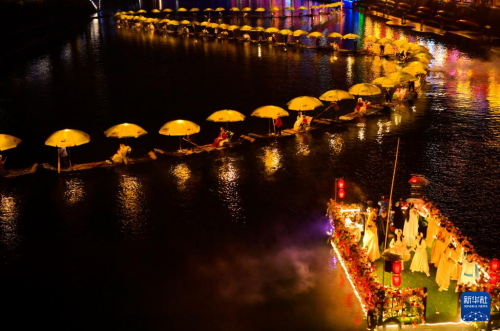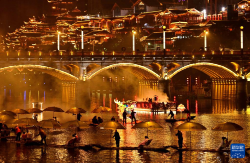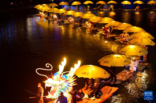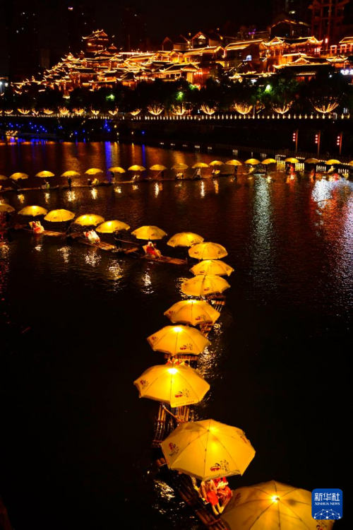 当日,在湖北省恩施土家族苗族自治州宣恩县贡水河上,一场“贡水游龙”迎新春活动吸引不少市民游客参与体验。“贡水游龙”由数十条竹筏作“龙身”,辅以灯光、音乐,人们可以在贡水河上“乘龙”观赏璀璨夜景,欢乐迎新春。