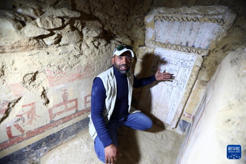 1月26日,在埃及塞加拉地区考古发掘现场,考古人员介绍一座墓葬墙上的文字。
