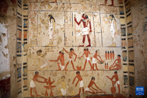 这是1月26日在埃及塞加拉地区考古发掘现场拍摄的一座墓葬墙上的装饰。