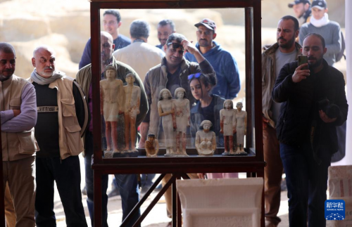1月26日,在埃及塞加拉地区考古发掘现场,人们聚集在出土的文物旁。