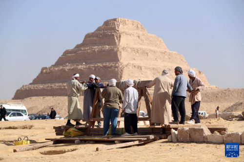 1月26日,在埃及塞加拉地区,工作人员聚集在考古发掘现场。