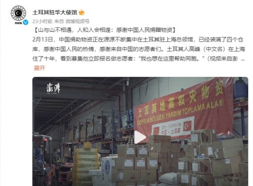 2月15日,土耳其驻华大使馆通过官方微博发文,感谢中国人民捐赠物资。