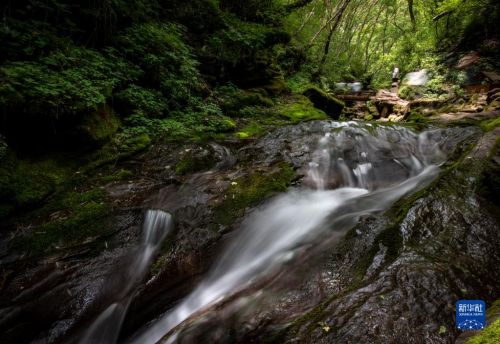 7月8日,游客徒步经过六盘山国家森林公园内一处溪流。新华社记者 冯开华 摄