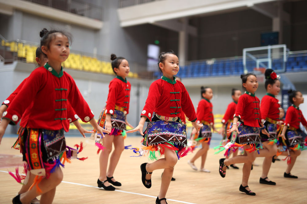 7月19日,孩子们在贵州省黔东南苗族侗族自治州丹寨县文化馆暑期免费舞蹈课上学习苗族非遗舞蹈“锦鸡舞”。