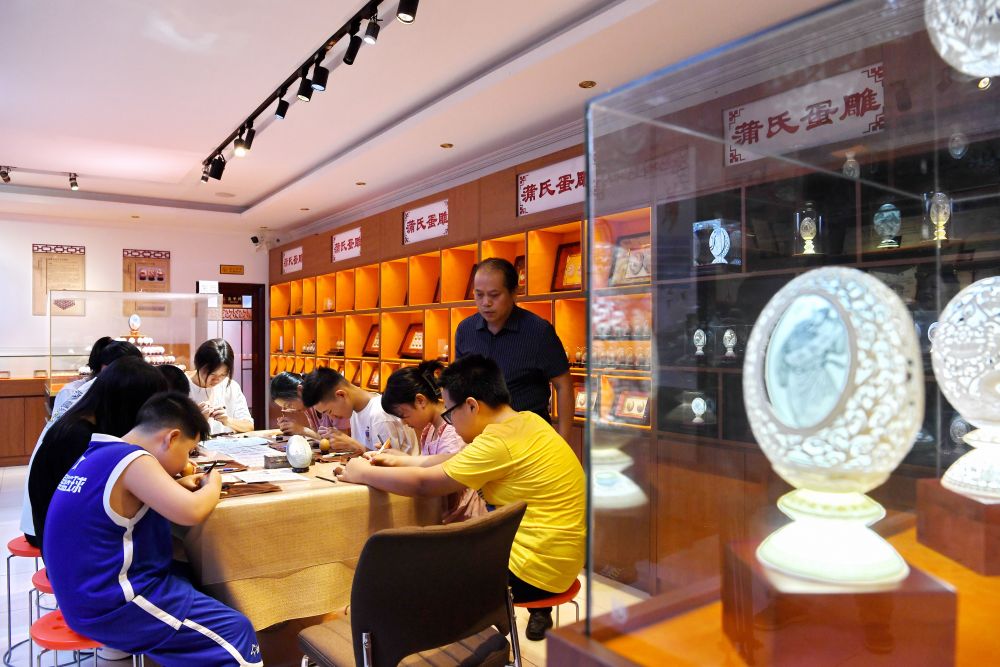 7月15日,学生在河北省涿州市蒲氏蛋雕非遗传承馆内学习蛋雕制作技艺。