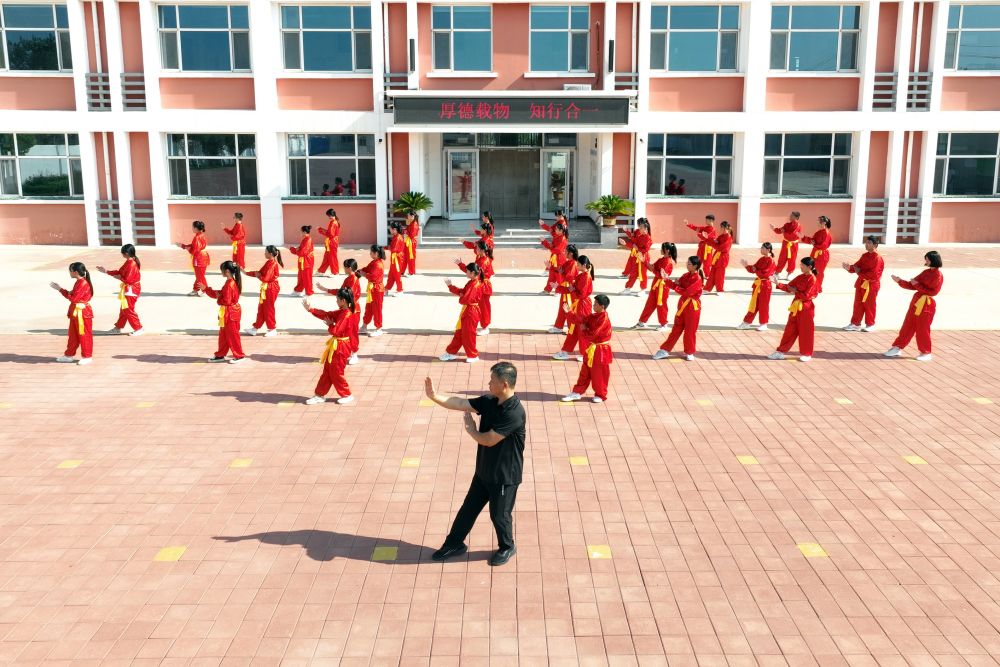8月14日,在河北省沧州市沧县汪家铺镇董辛庄小学,老师带领学生习练武术(无人机照片)。