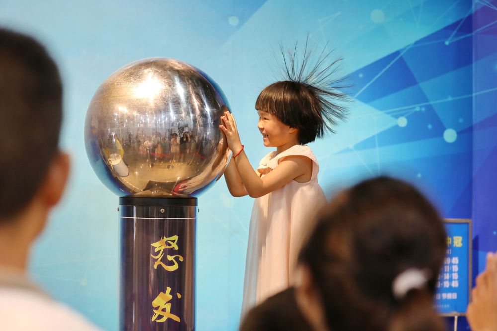 7月29日,在浙江省嘉兴市科技馆,小朋友体验“怒发冲冠”实验。