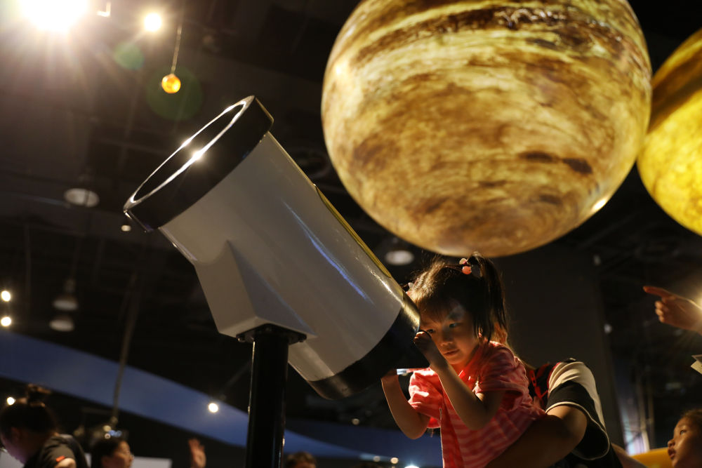 8月6日,一名小朋友在位于沈阳市的辽宁省科技馆里体验望远镜。