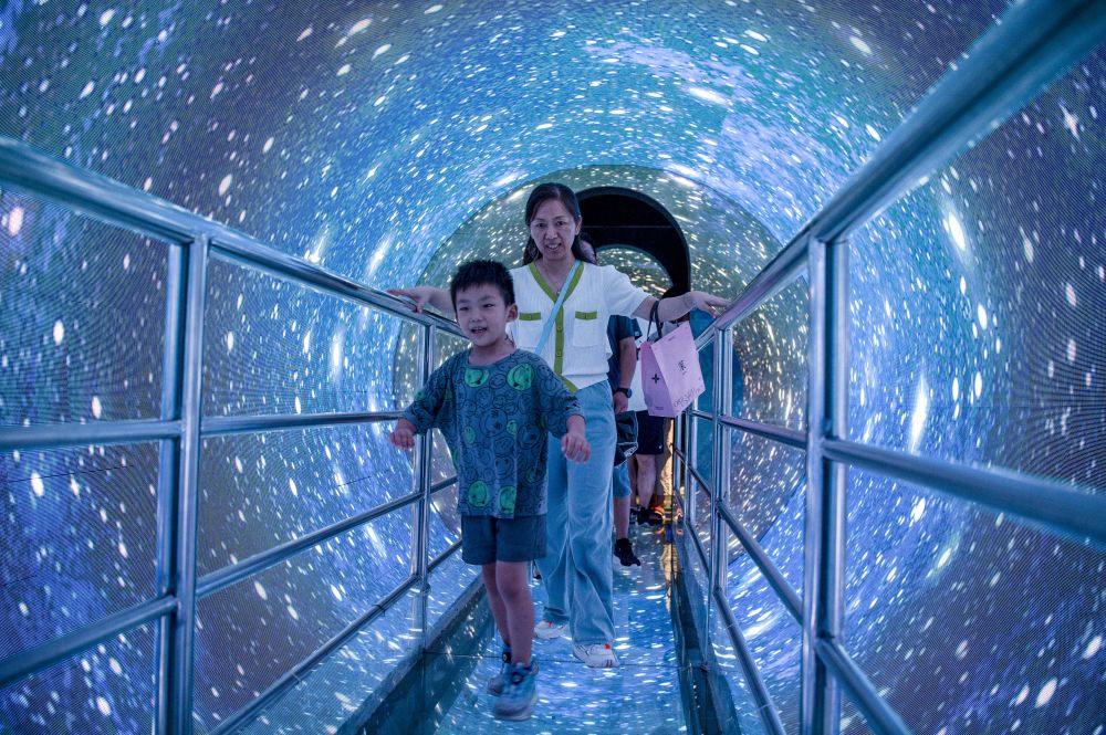 8月27日,小朋友在浙江省金华市金华之光文化广场科技馆里体验科普项目。
