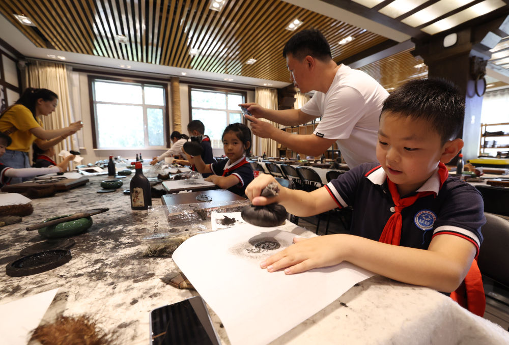 7月27日,在河北省平山县中山古城国家考古遗址公园,石家庄市新华区西三庄学校学生在体验玉器拓片。