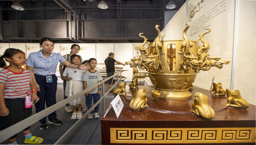8月27日,工作人员在江苏泰州科技馆中国古代科技展区给小朋友讲解。