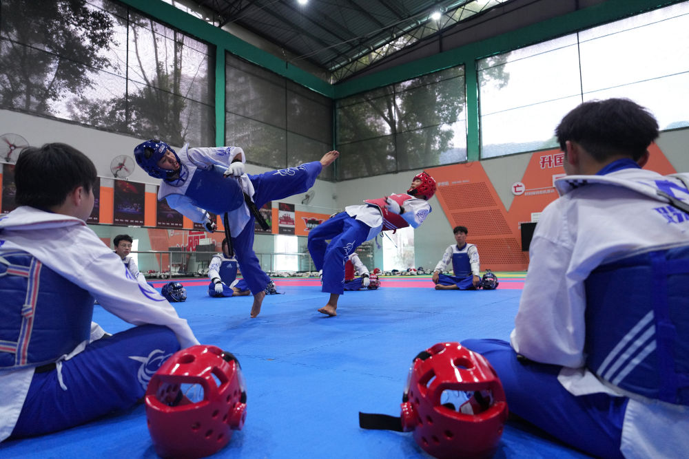 7月18日,在重庆市北碚职业教育中心跆拳道训练馆,学生进行跆拳道竞技项目腿法训练。