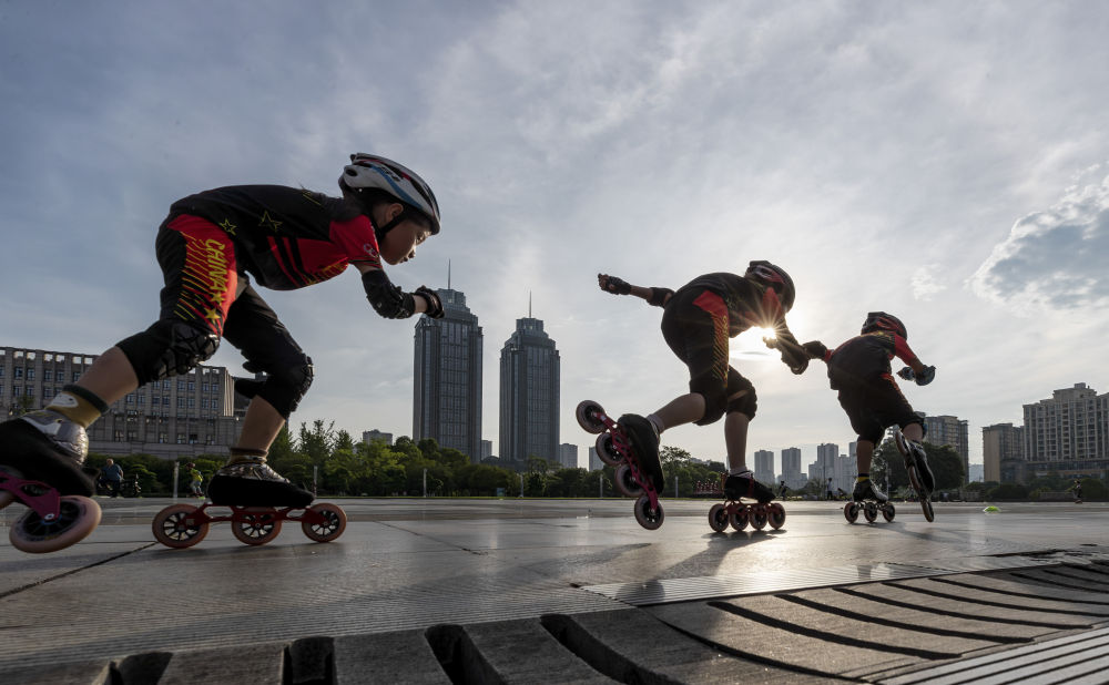 7月30日,孩子们在重庆市南川区市民广场迎着朝阳练习轮滑。