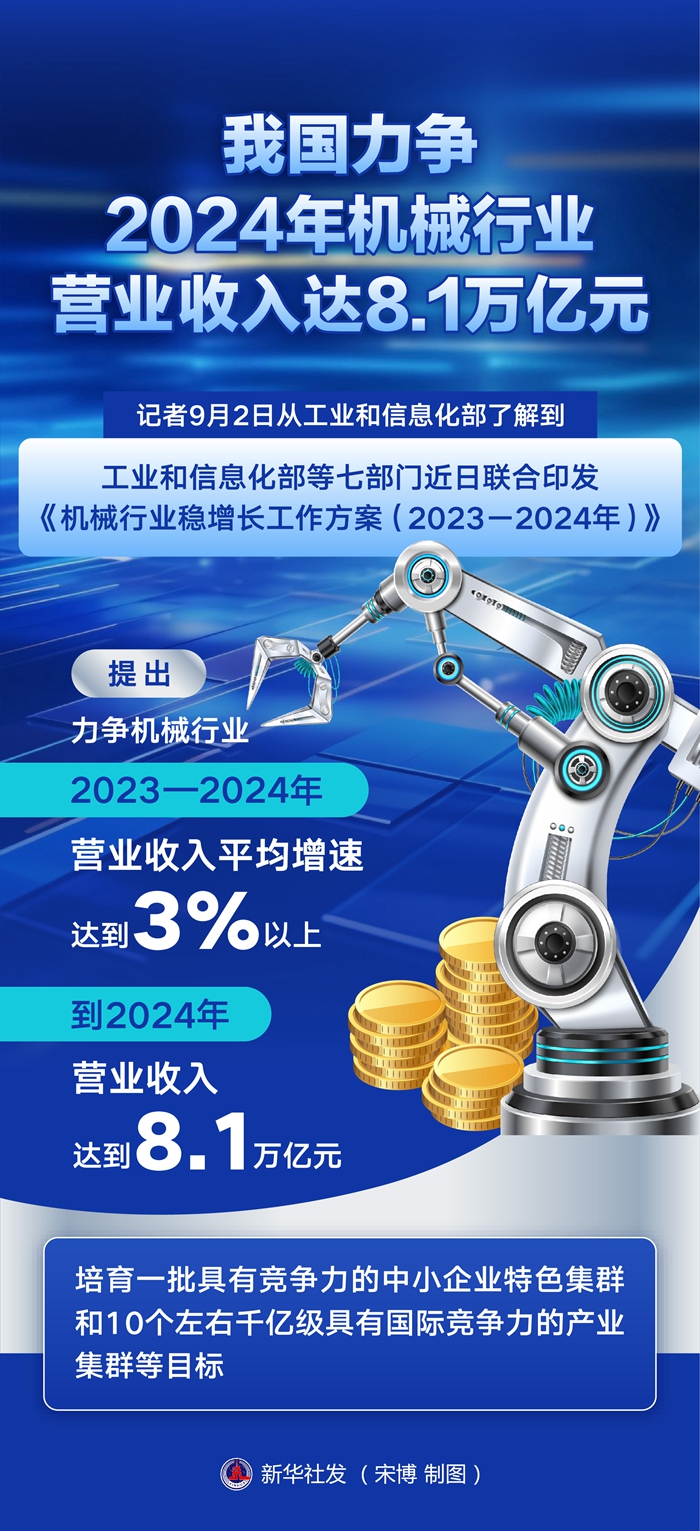 新华社北京9月2日电(记者严赋憬)记者2日从工业和信息化部了解到,工业和信息化部等七部门近日联合印发《机械行业稳增长工作方案(2023—2024年)》,提出2023—2024年力争机械行业营业收入平均增速达到3%以上,到2024年达到8.1万亿元,培育一批具有竞争力的中小企业特色集群和10个左右千亿级具有国际竞争力的产业集群等目标。