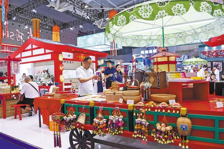 文博会“文旅消费馆·一带一路国际馆”陕西展台,观众选购特色商品。 新华社记者 梁旭摄