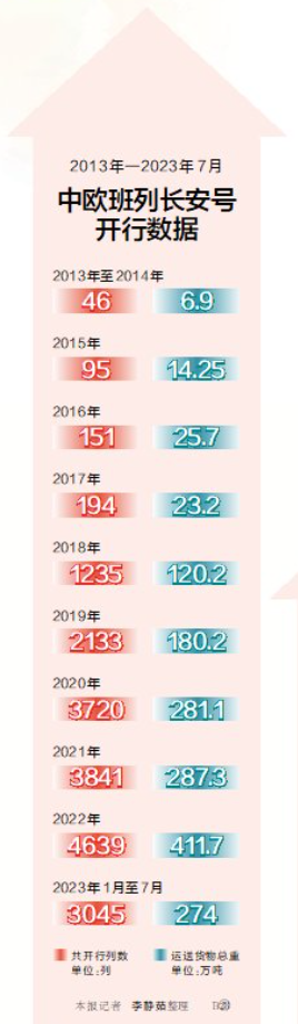 中欧班列长安号自2013年首开以来,运营质效逐年跨越式提升,截至2023年7月底累计开行19099列。今年开行3045列,同比增长37.3%;运送货物总重274万吨,同比增长47.7%;班列开行量、货运量、重箱率等核心指标稳居全国第一。
