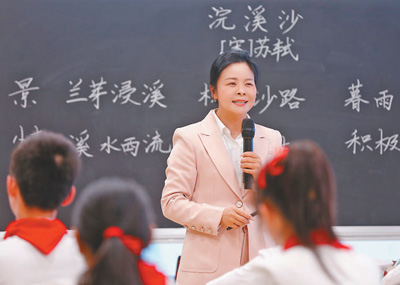 云南省曲靖市第二小学校长、教师李青霖在讲课。