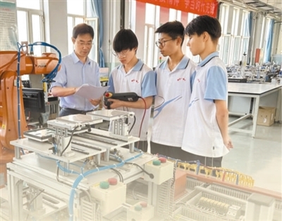 天津市滨海新区塘沽第一职业中等专业学校教师翟津(左一)在指导参加工业机器人竞赛的选手。