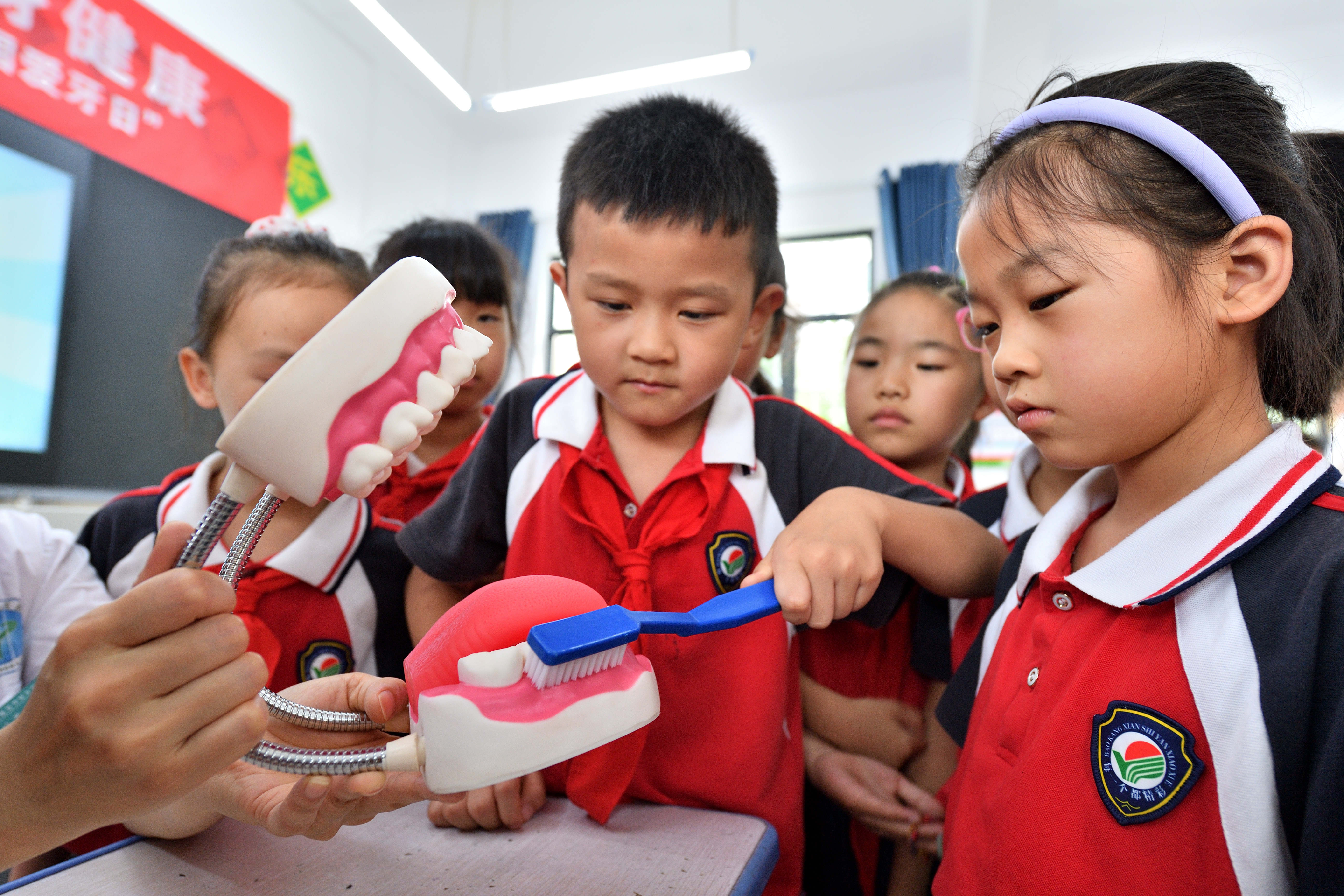 9月18日,湖北省襄阳市保康县实验小学学生在学习正确的刷牙方法。通讯员 杨韬 黄丽 摄