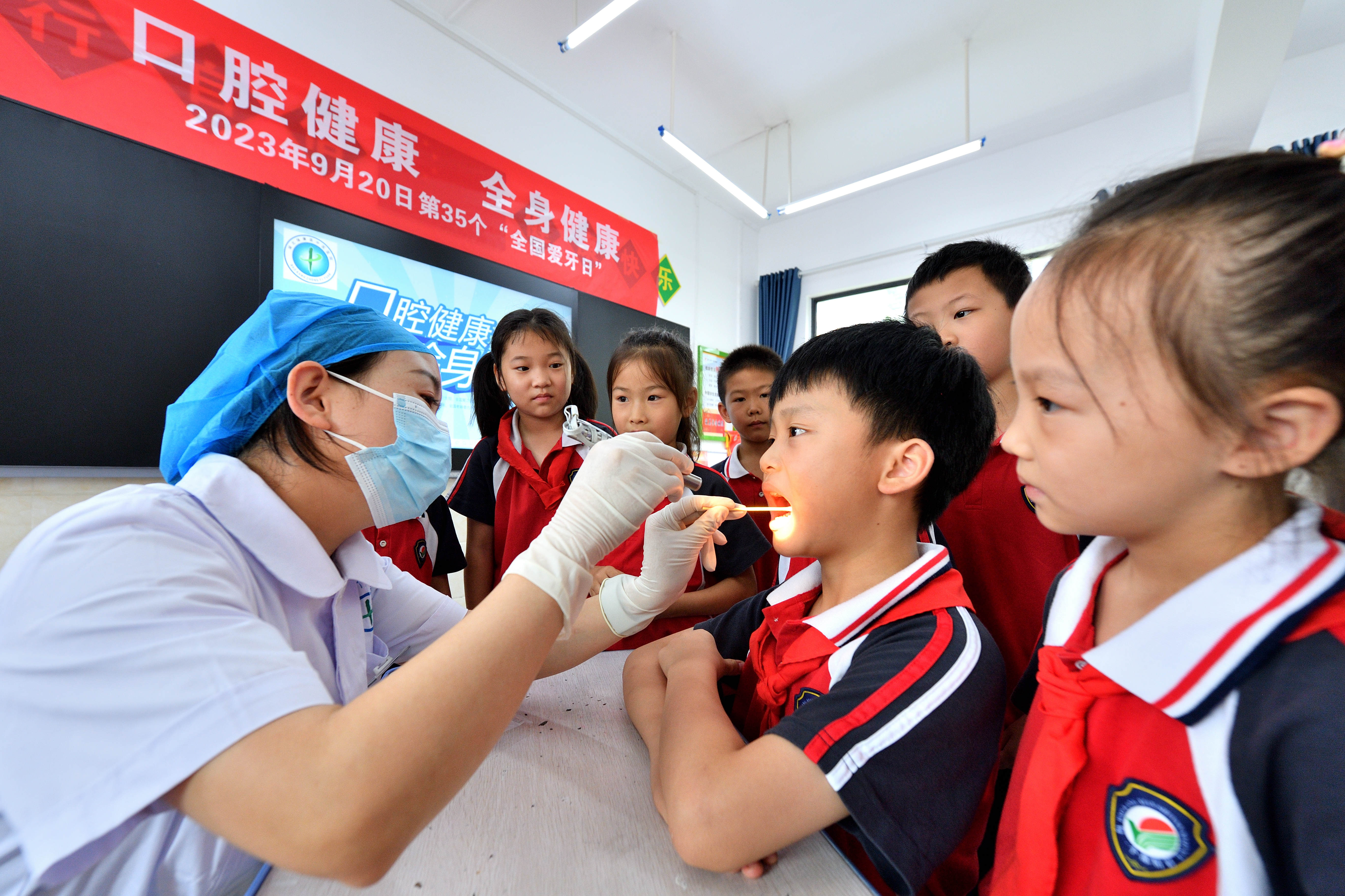 9月18日,在湖北省襄阳市保康县实验小学,口腔科医生为学生检查牙齿。通讯员 杨韬 黄丽 摄