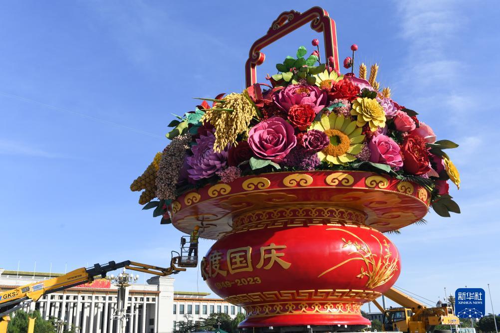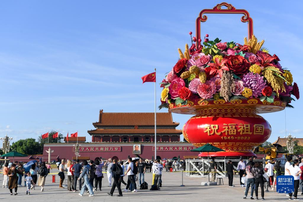 当日,“祝福祖国”巨型花篮主体亮相北京天安门广场,花篮顶高18米,篮内首次选取了喜庆丰收的五谷(水稻、小麦、小米、黄米、大豆),结合具有美好寓意的花卉,体现花团锦簇、五谷丰登;篮体南侧书写“祝福祖国,1949-2023”字样,篮体北侧书写“欢度国庆,1949-2023”字样。