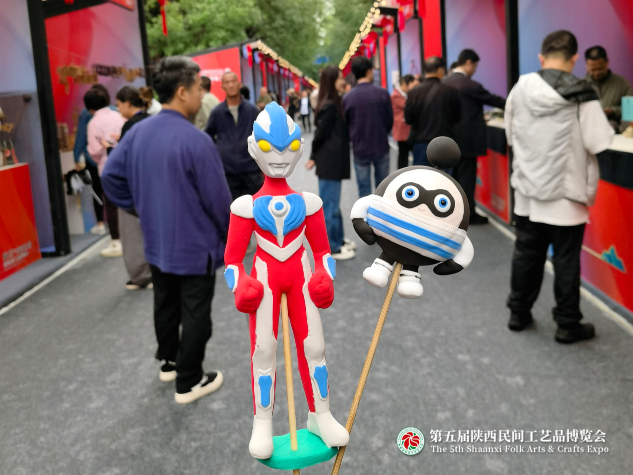 游客于女士带着小朋友很偶然的来到了博览会活动现场,蛋雕、马勺脸谱、皮影、剪纸、面塑、花馍等工艺品一直吸引着小朋友驻足观看,除了带小朋友体验陕西民间工艺品展览,还与工艺美术大师进行了现场互动,“小朋友一直吵着要奥特曼,这个面塑看着做工很精美就给他买了,这种具有陕西地方特色的民间工艺品博览会还真值得一看。”