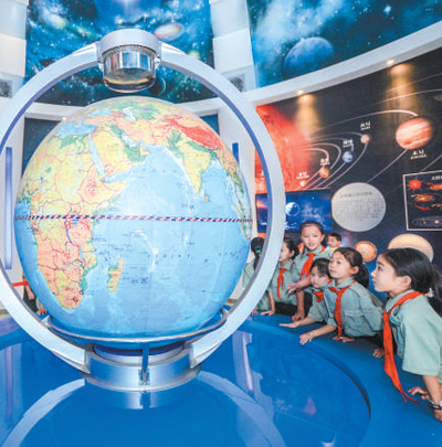 浙江湖州长兴县金钉子地质科普馆内,槐坎中心小学的学生们在了解地球地理知识。