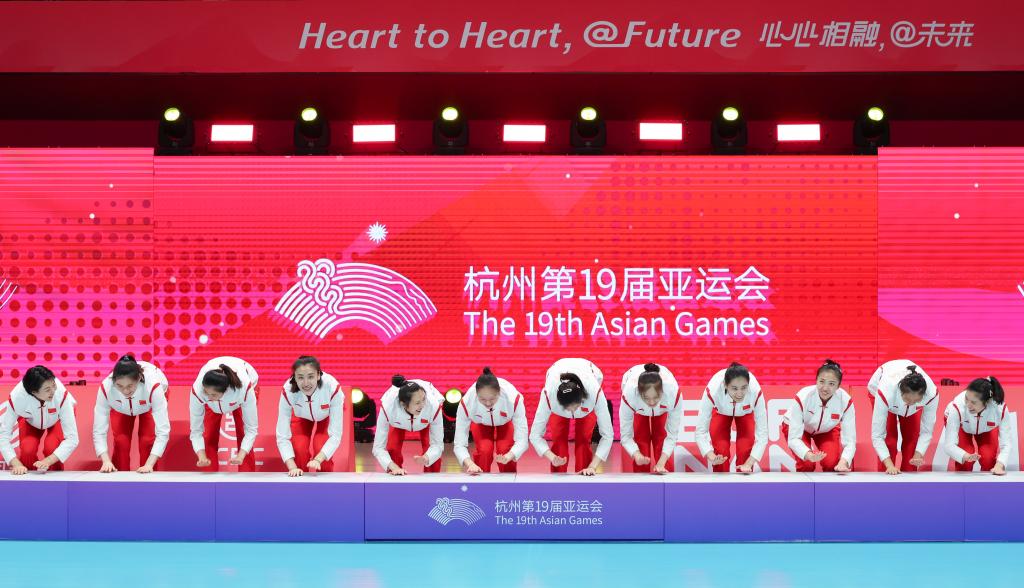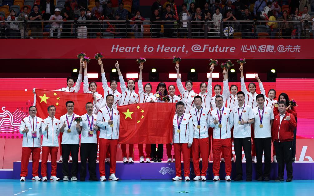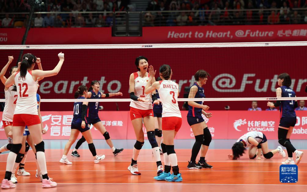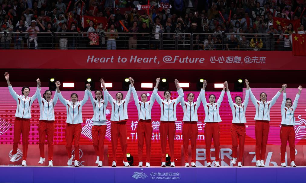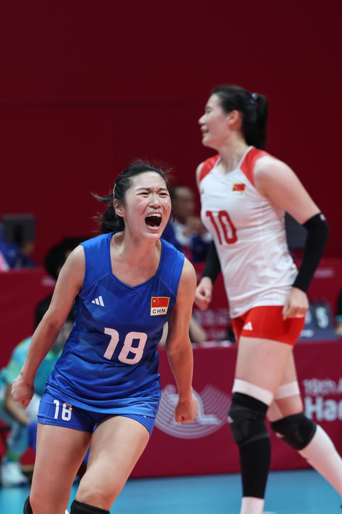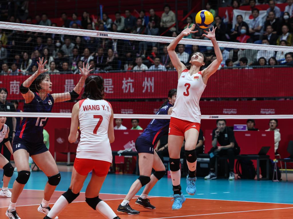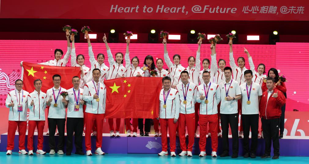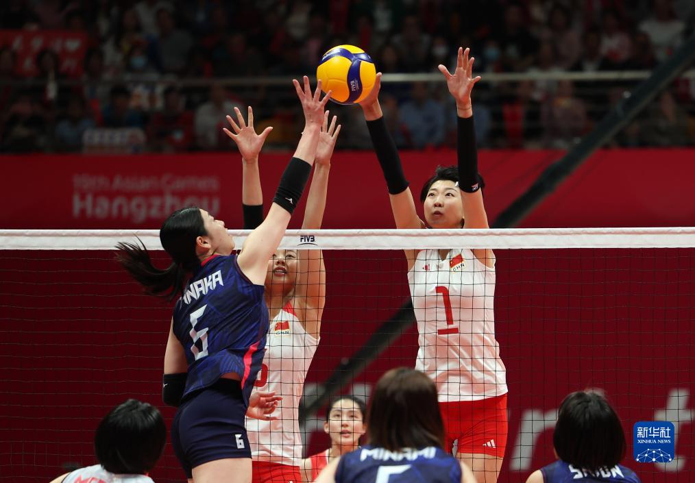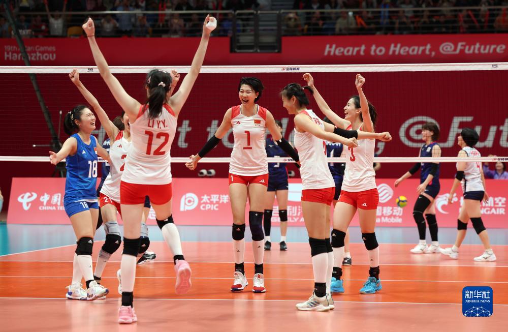 当日,在杭州亚运会女子排球决赛中,中国队以3比0战胜日本队,获得冠军。