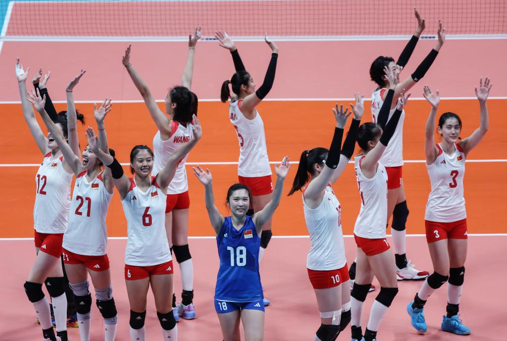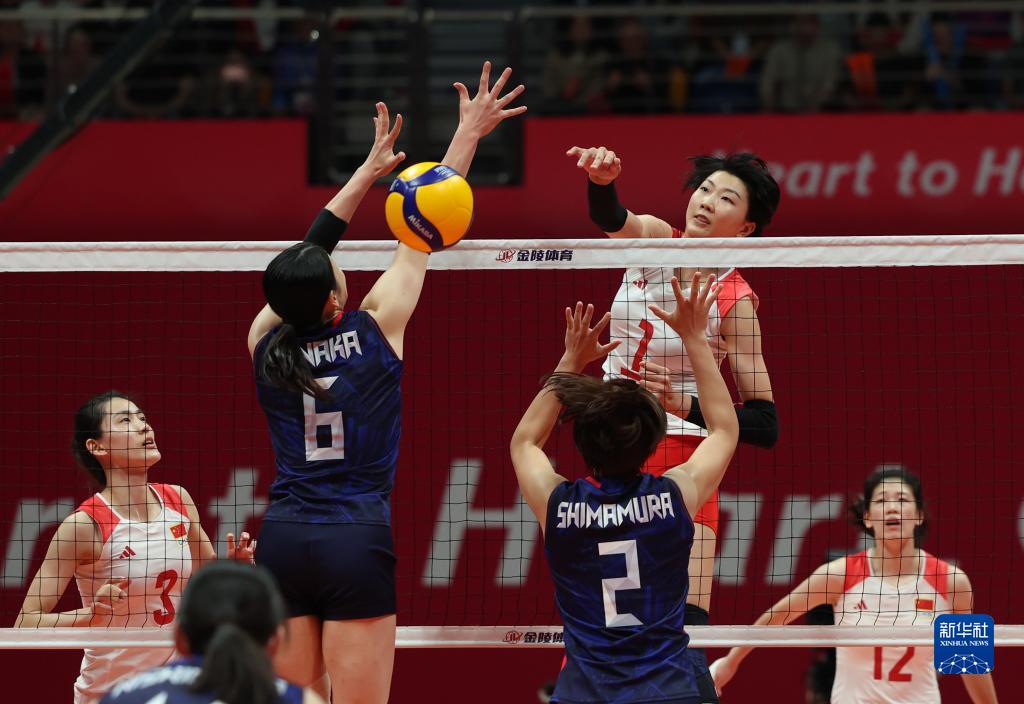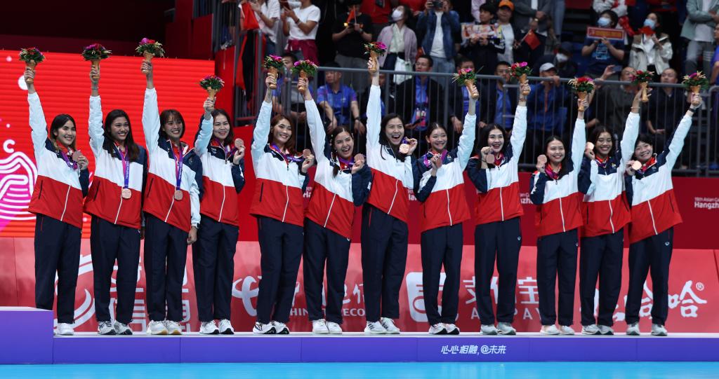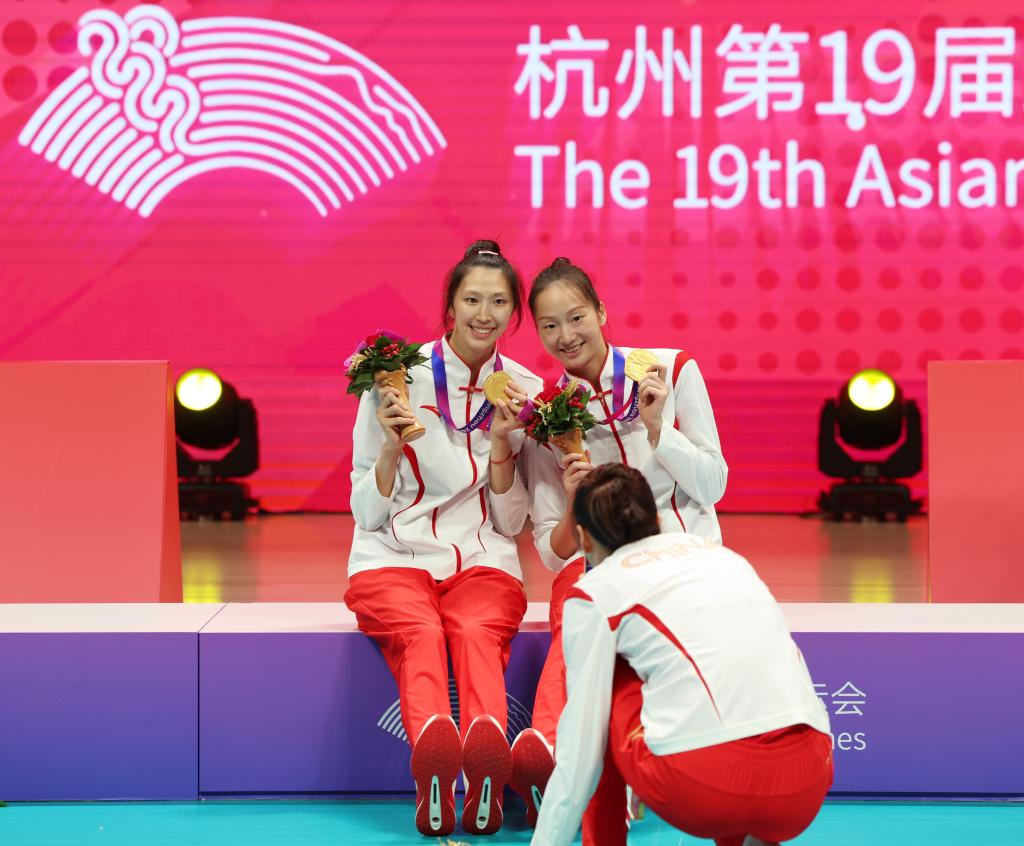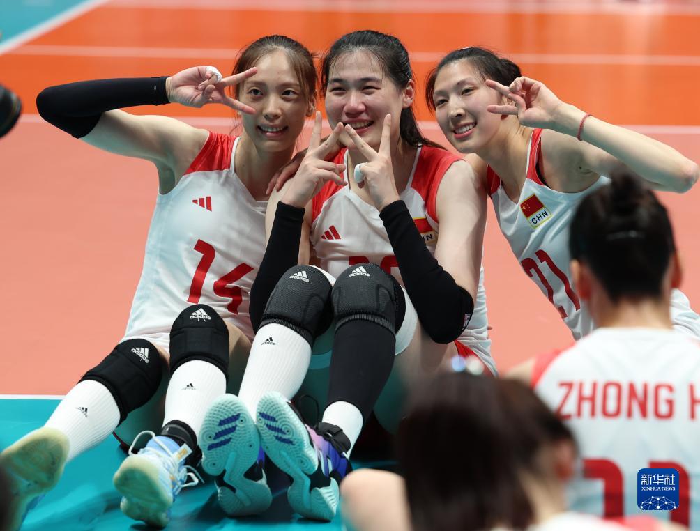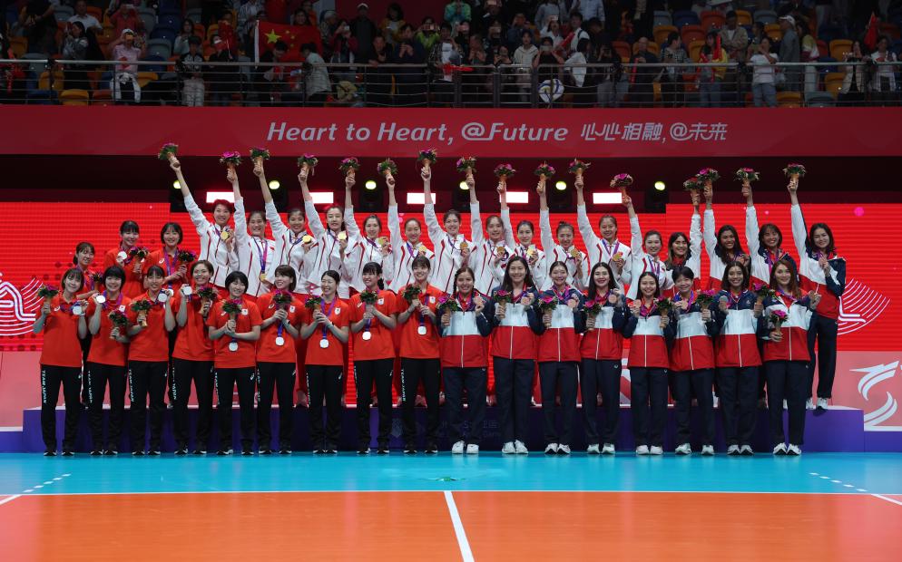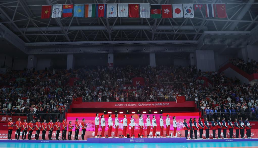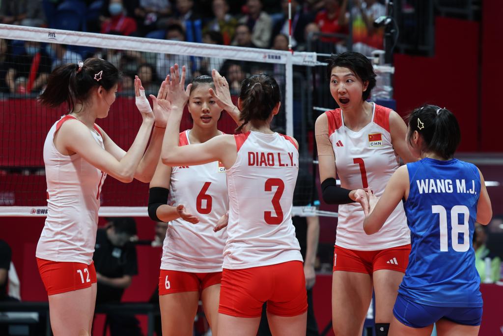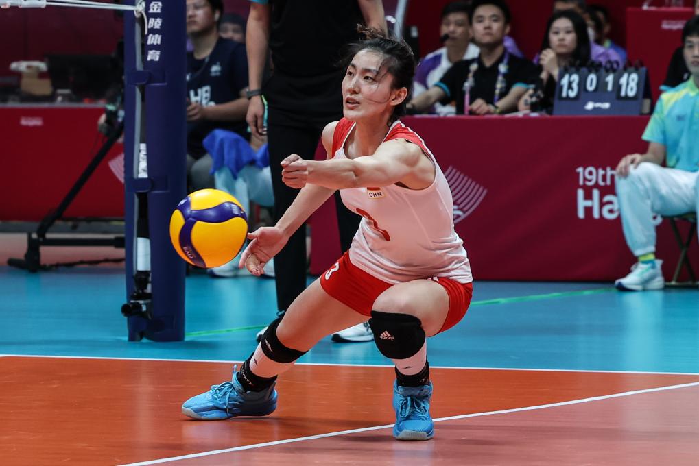 当日,在杭州亚运会女子排球决赛中,中国队以3比0战胜日本队,获得冠军。