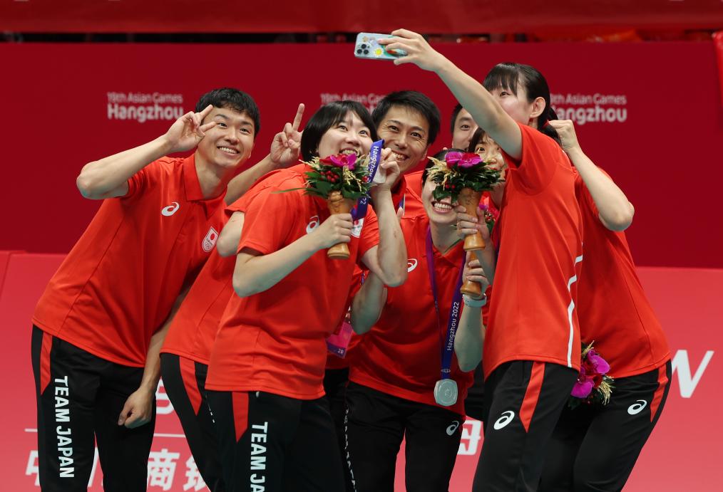 10月7日,亚军日本队球员在颁奖仪式后留影。