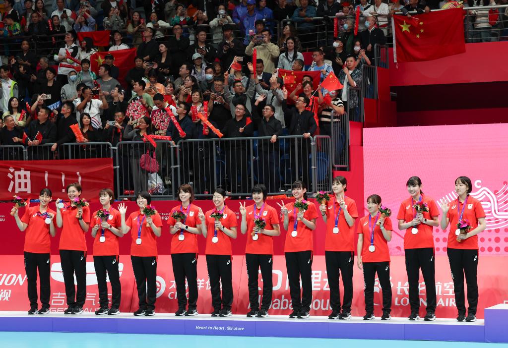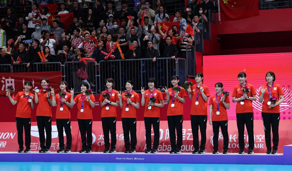 10月7日,亚军日本队在颁奖台上庆祝。