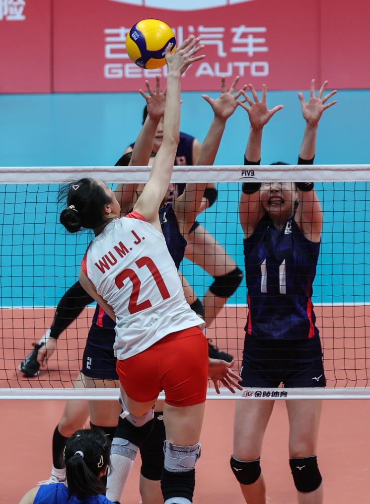 10月7日,中国队球员吴梦洁(左)在比赛中扣球。