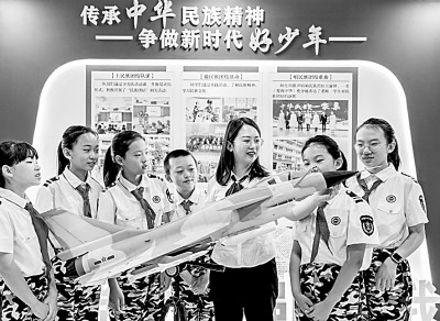 9月14日,内蒙古自治区呼和浩特市玉泉区五塔寺东街小学学员们学习国防知识,增强国防观念。丁根厚摄/光明图片