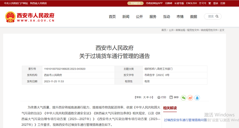 人民网西安11月25日电(记者邹星)11月25日,西安市人民政府发布《关于过境货车通行管理的通告》,通告具体内容如下: