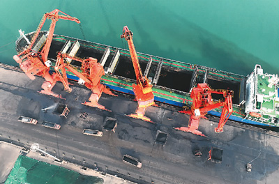 连日来,江苏连云港港加快冬季电煤运输和储备,全力保障发电企业供暖用煤需求。图为11月22日,货轮在连云港港煤炭码头卸载电煤。