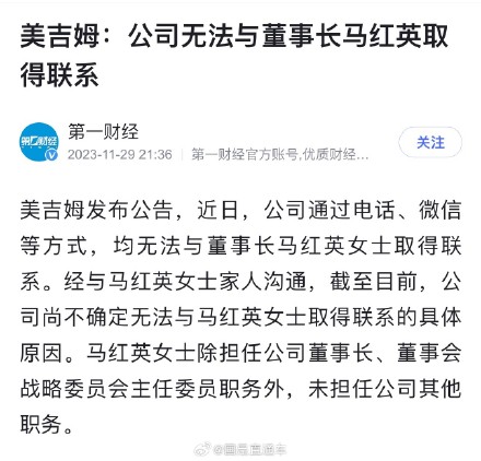 美吉姆发布公告,近日,公司通过电话、微信等方式,均无法与董事长马红英女士取得联系。经与马红英女士家人沟通,截至目前,公司尚不确定无法与马红英女士取得联系的具体原因。马红英女士除担任公司董事长、董事会战略委员会主任委员职务外,未担任公司其他职务。(第一财经)