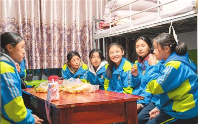 每天下了晚自习,斯曲卓玛会和好朋友挽着手走回宿舍,在宿舍里完成老师布置的蹲起和仰卧起坐等锻炼任务。熄灯之后,斯曲卓玛还要再跟舍友们“卧谈”一会儿。她说:“学校就像我另一个家!”