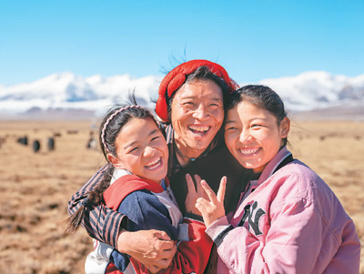 斯曲卓玛(右)和爸爸、妹妹一起。