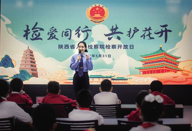 陕西省人民检察院在西安市雁塔区人民检察院举办“检爱同行 共护花开”检察开放日活动。图为检察官张洋与孩子们互动(资料照片)。 受访单位供图