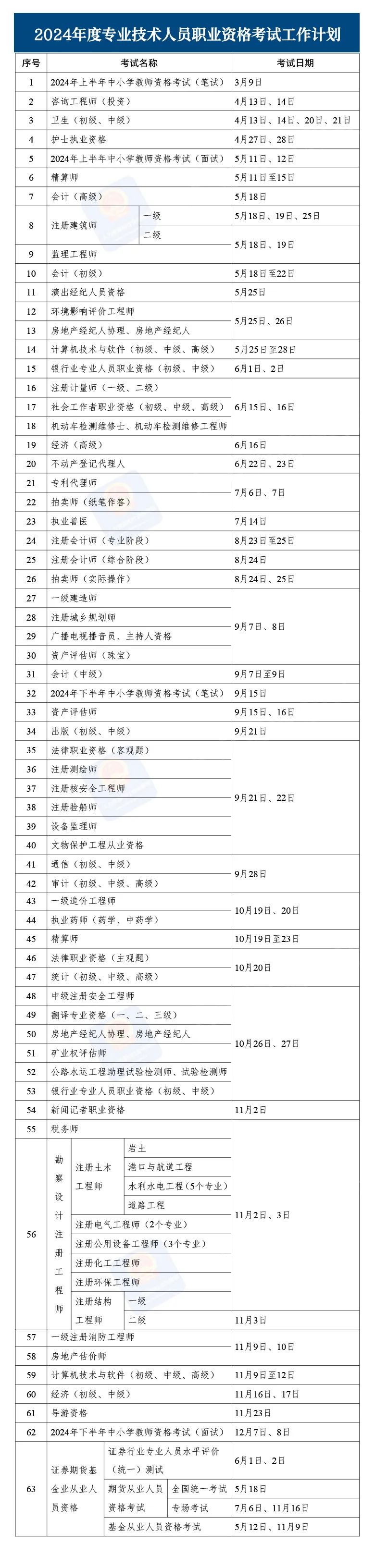 中新网11月17日电 近日,人力资源社会保障部办公厅印发《关于2024年度专业技术人员职业资格考试工作计划及有关事项的通知》,明确了考试时间表。