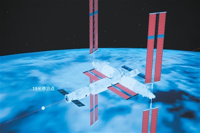 天舟七号货运飞船与空间站组合体进行交会对接的模拟图像。