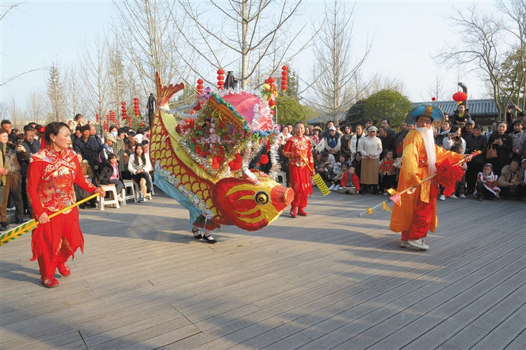 2月11日,在汉中市汉台区天汉湿地公园,天汉民间艺术团演员为游客表演采莲船等节目。 通讯员 李正社摄