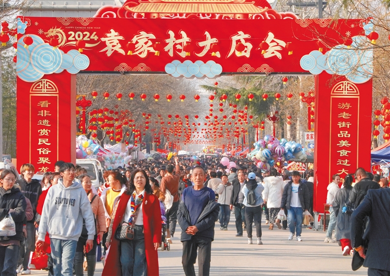 2月12日,游客在礼泉县袁家村观光游览,品尝特色小吃。2月10日至12日,袁家村接待游客近50万人次。 记者 许奥博摄