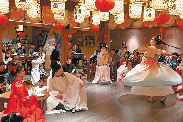 2月11日,游客在长安十二时辰主题街区沉浸式体验唐风市井生活,观看演出。记者 杨小兵摄