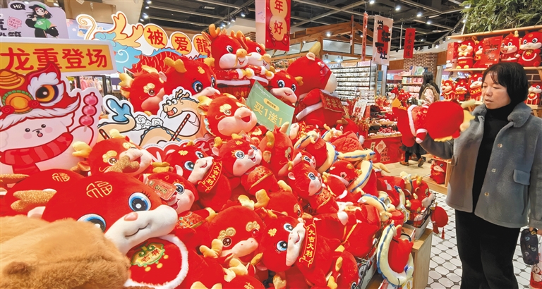 近期,西安多家商场销售龙年吉祥物。图为2月12日,游客在商场挑选商品。记者 杜玮摄