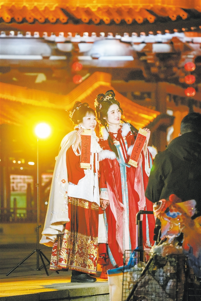 大唐不夜城灯火辉煌,古色古香,游客如云,各种演艺令人目不暇接,古老与现代交织的魅力让人沉醉。游人在挂满唐诗灯牌的树下穿行,于斑驳光影中品味唐诗,与“李白”吟诗作对;在街上与身着华丽汉服的丽人擦肩而过,回眸间只见花钿笑颜、明眸流转,一瞬间令人以为穿越回了唐朝。