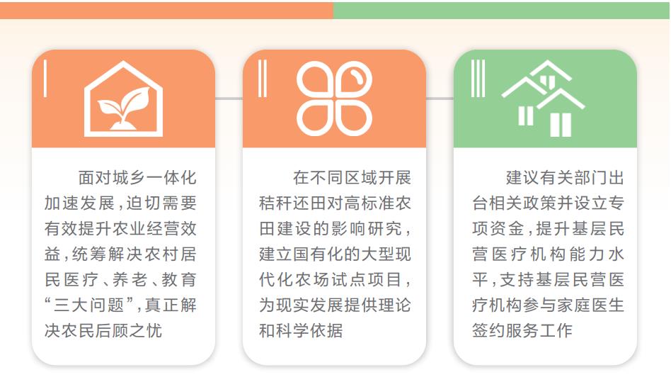 政府工作报告强调,着眼促进农民增收,壮大乡村富民产业,发展新型农业经营主体和社会化服务,培养用好乡村人才。杨春平说,面对城乡一体化加速发展,迫切需要有效提升农业经营效益,统筹解决农村居民医疗、养老、教育“三大问题”,真正解决农民后顾之忧,把满足农民对美好生活的向往与推进乡村全面振兴一体融合。