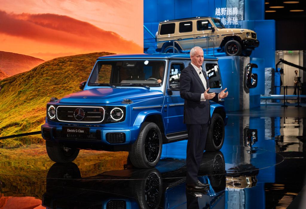 4月25日,在北京中国国际展览中心顺义馆举行的2024北京车展上,梅赛德斯—奔驰集团股份公司董事会成员唐仕凯介绍梅赛德斯—奔驰纯电G级越野车。新华社记者 才扬 摄