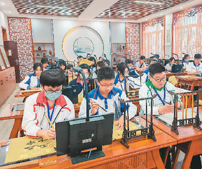 5月7日,参加“宁夏历史文化、自然资源与环境保育探索之旅”交流活动的香港中学生在宁夏银川市第六中学学写毛笔字。