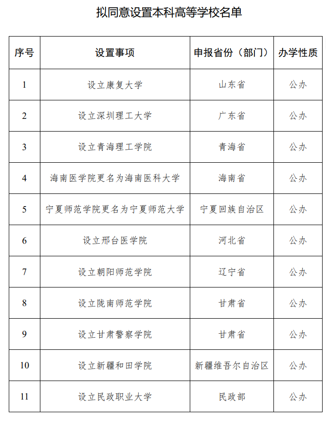 人民网北京5月15日电 (记者李依环)教育部网站5月15日发布消息,根据高等教育法、《普通高等学校设置暂行条例》等有关规定以及第八届全国高等学校设置评议委员会考察评议结果,经教育部党组会议审议,拟同意设置康复大学等24所学校。其中,2所高校更名,21所高校为新设、1所高校为转设。